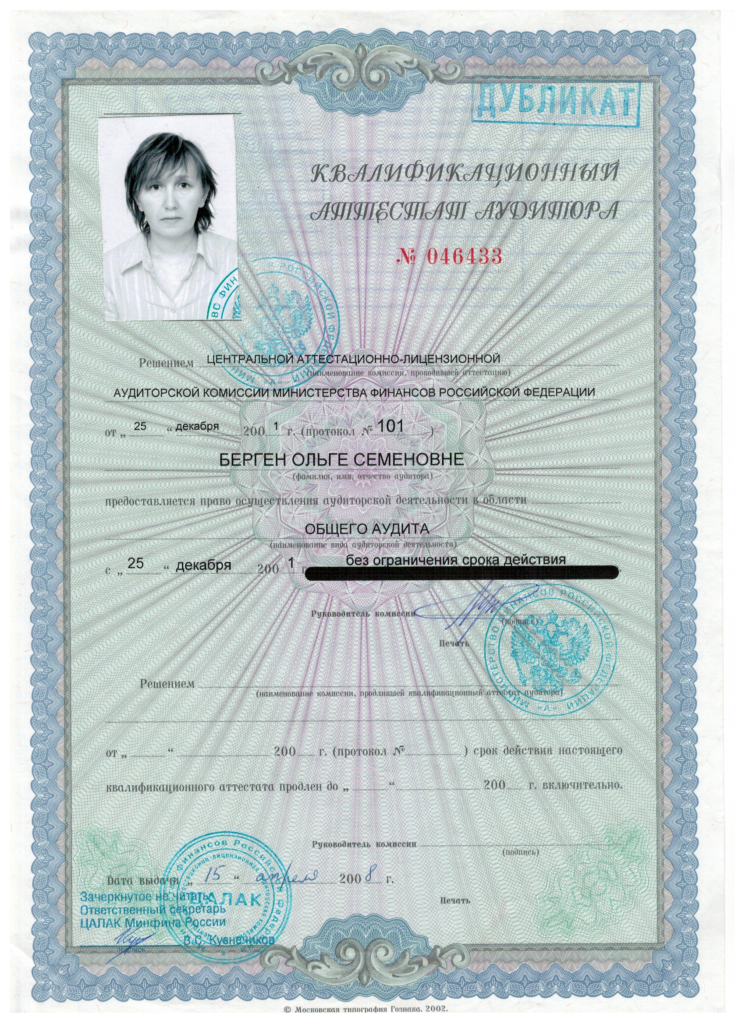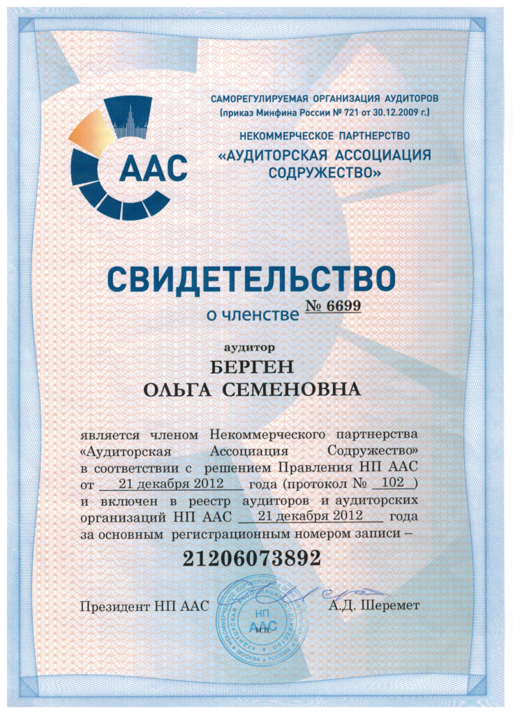 Аудитор – Берген Ольга Семеновна член СРО «ААС» ОРНЗ 21206073892, квалификационный аттестат № 046433 от 14.04.2008г., бессрочный