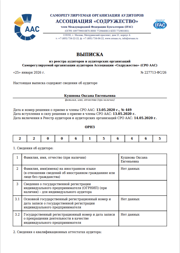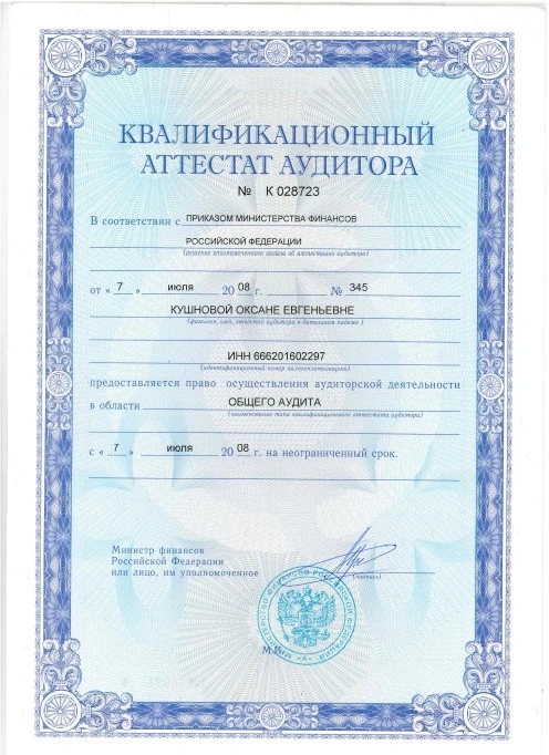 Аудитор — Кушнова Оксана Евгеньевна член СРО «ААС» ОРНЗ 22006156465, квалификационный аттестат аудитора К 028723 от 7.07.2008г.