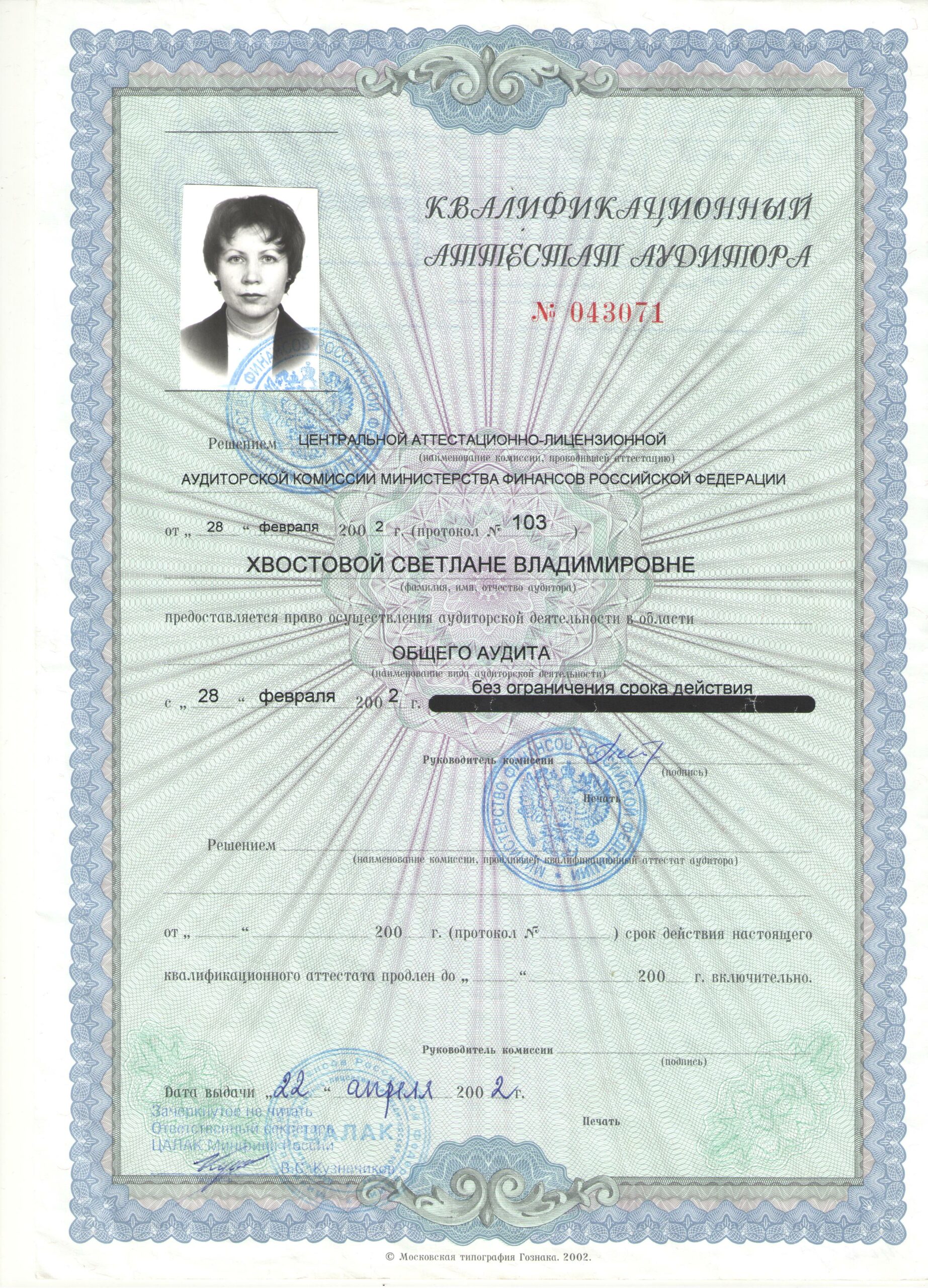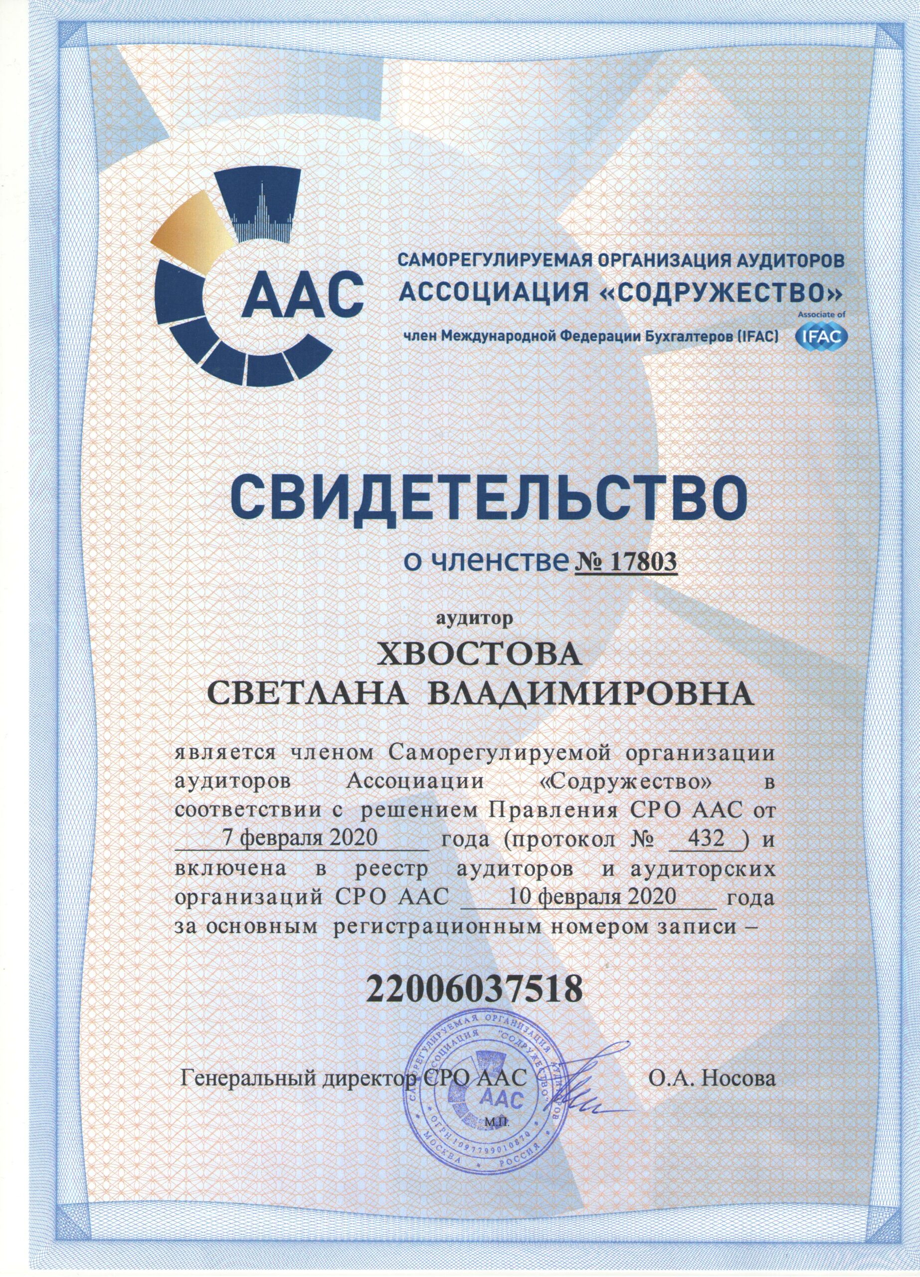 Заместитель директора — Хвостова Светлана Владимировна член СРО «ААС» ОРНЗ 22006037518, квалификационный аттестат аудитора № 043071 (общий аудит), дата выдачи 28.02.2002г.