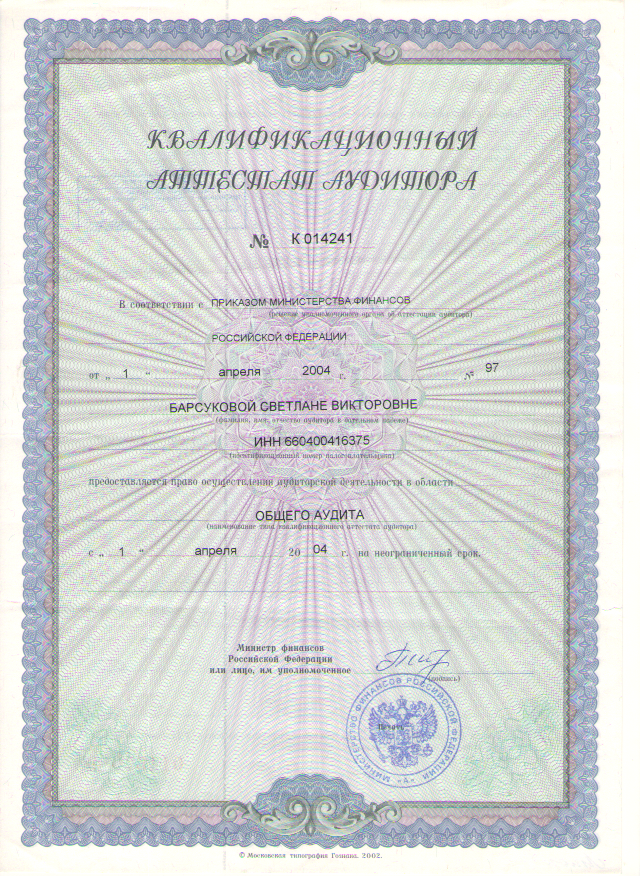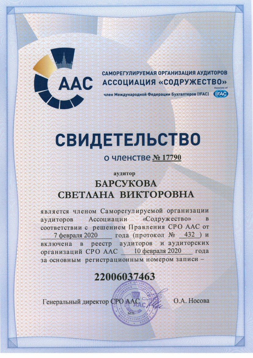 Директор — Барсукова Светлана Викторовна — член СРО «ААС» (ОРНЗ 22006037463), квалификационный аттестат аудитора № К014241 выдан 01.04.2004г.