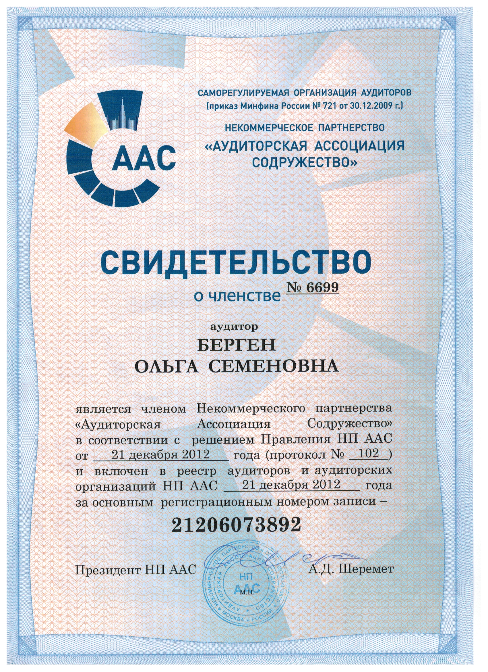 Аудитор – Берген Ольга Семеновна член СРО «ААС» ОРНЗ 21206073892, квалификационный аттестат № 046433 от 14.04.2008г., бессрочный